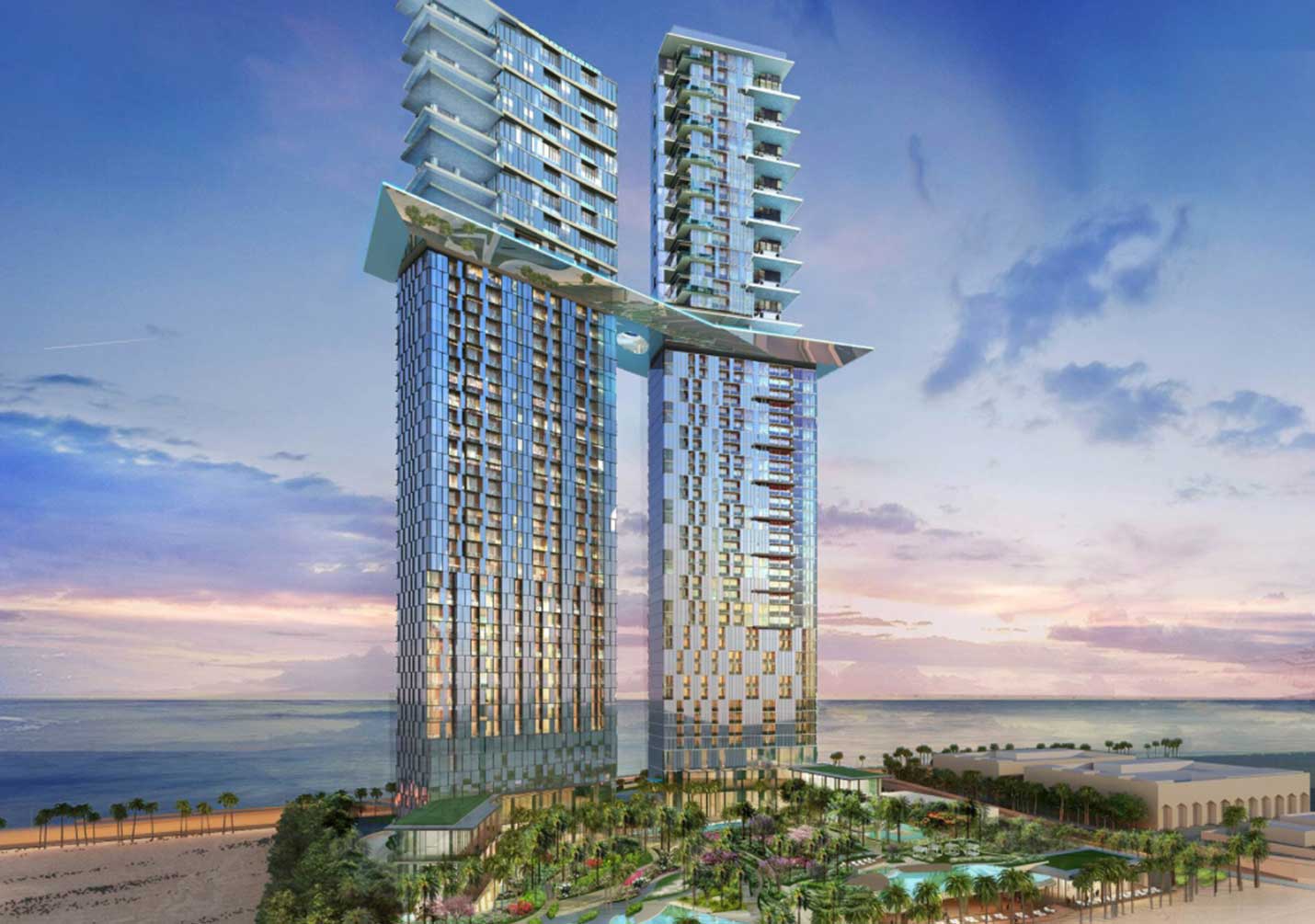 Palm 360 is a landmark development located on the Palm Jumeirah Boardwalk, featuring two iconic towers that house a luxury hotel and branded residences. The towers are connected by one of the largest infinity sky pools in the world, situated approximately 160 meters above ground. The project’s tallest tower reaches 261.55 meters, making it the tallest building on Palm Jumeirah.